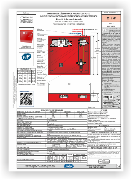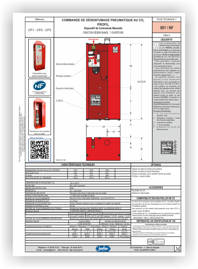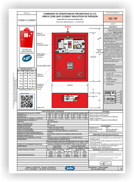 Référence Description 001/NF PROFIL 017/NF COMPACT 018/NF MULTIZONES 019/NF BI-ZONES 025/NF MONO ZONE 027/NF PROFIL X 028/NF BI-ZONES avec Éléments Indicateurs de Pression 029/NF BI-ZONES BI-FONCTION avec Éléments Indicateurs de Pression 030/NF DOUBLE ZONE avec Éléments Indicateurs de Pression 031/NF DOUBLE ZONE BI-FONCTION avec Éléments Indicateurs de Pression 032/NF SIMPLE ZONE avec Élément Indicateur de Pression 033/NF SIMPLE ZONE BI-FONCTION avec Élément Indicateur de Pression 034/NF MONO ZONE avec Élément Indicateur de Pression 035/NF MONO ZONE BI-FONCTION avec Élément Indicateur de Pression T2000 Commandes de désenfumage pneumatique au CO2 T2039 Bouteilles de CO2 rechargeables constructeur à usage unique - température de fonctionnement 50°C maxi. T2131 Module de télécommande pneumatique T2132 Module de télécommande électrique T2168 Commande de désenfumage pneumatique au CO2 MultiZones - 1 BI-ZONES + 1 SIMPLE ZONE T2173 Commande de désenfumage pneumatique au CO2 MultiZones - 1 BI-ZONES + 1 SIMPLE ZONE avec Éléments Indicateurs de Pression T2174 Pièces détachées pour commande de désenfumage pneumatique au CO2