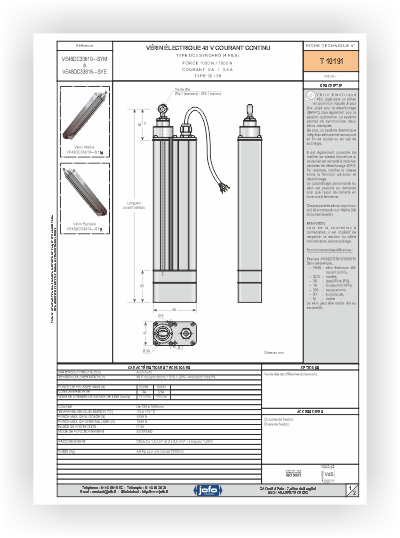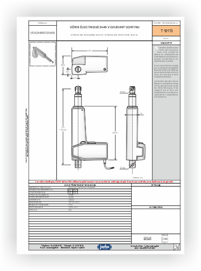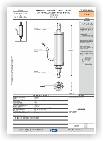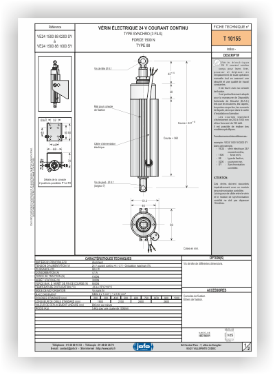 Référence Description T10108 Vérin électrique 24 V courant continu, module de surcharghe intégré - force 650/1000 N - Types 16 à 88 T10112 Vérin électrique 24 V courant continu, module de surcharghe intégré - force 650/1000 N - Types 16-18/20/26-28/36-38 T10113 Vérin électrique 24 V courant continu, module de surcharghe intégré - force 650/1000 N - Types 46-48 T10114 Vérin électrique 24 V courant continu, module de surcharghe intégré - force 650/1000 N - Types 76-78 T10117 Vérin électrique 24 V courant continu, module de surcharghe intégré - force 650/1000 N - Types 56-58/66-68/86-88 T10118 Vérin électrique 24 V courant continu - force 650/1000 N - Types 16 à 88 T10119 Vérin électrique 24 V courant continu - force 650/1000 N - Types 16-18/20/26-28/36-38 T10120 Vérin électrique 24 V courant continu - force 650/1000 N - Types 46-48 T10121 Vérin électrique 24 V courant continu - force 650/1000 N - Types 56-58/66-68/86-88 T10122 Vérin électrique 24 V courant continu - force 650/1000 N - Types 76-78 T10132 Vérin électrique 24 V courant continu, modèle T60 - force 650 N - Types 16 à 88 T10134 Vérin électrique 24 V courant continu, modèle T60 - force 650 N - Types 16-18/20/26-28/36-38 T10141 Vérin électrique 24 V courant continu, modèle T60 - force 650 N - Type 18 T10135 Vérin électrique 24 V courant continu, modèle T60 - force 650 N - Types 46-48 T10131 Vérin électrique 24 V courant continu, modèle T60 - force 650/1000 N - Types 56-58/66-68/86-88 T10136 Vérin électrique 24 V courant continu, modèle T60 - force 650/1000 N - Types 76-78 T10137 Vérin électrique 24 V courant continu, modèle 1,1 A - force 1000 N - Types 16-18-20-26-28-36-38-46-48-56-58-66-68-76-78-86-88 T10133 Vérin électrique 24 V courant continu, modèle 1,1 A - force 1000 N - Types 16-18/20/26-28/36-38 T10138 Vérin électrique 24 V courant continu, modèle 1,1 A - force 1000 N - Types 46-48 T10139 Vérin électrique 24 V courant continu, modèle 1,1 A - force 1000 N - Types 56-58/66-68/86-88 T10140 Vérin électrique 24 V courant continu, modèle 1,1 A - force 1000 N - Types 76-78 T10145 Vérin électrique 24 V courant continu, modèle T60 - 3,2 A - force 650 N - Types 16-18-20-26-28-36-38 T10146 Vérin électrique 24 V courant continu, module de surcharge intégré - force 1500 N - Types 18-38-88 T10124 Vérin électrique 24 V courant continu, module de surcharge intégré - force 1500 N - Types 18/38 T10126 Vérin électrique 24 V courant continu, module de surcharge intégré - force 1500 N - Type 88 T10149 Vérin électrique 24 V courant continu, module de surcharge intégré et fin de course - force 1800 N - Type 88 T10147 Vérin électrique 24 V courant continu, module de surcharge intégré - force 2500 N - Types 18-38-88 T10129 Vérin électrique 24 V courant continu, module de surcharge intégré - force 2500 N - Types 18/38 T10130 Vérin électrique 24 V courant continu, module de surcharge intégré - force 2500 N - Types 88 T10151 Vérin électrique 24 V courant continu avec module de surcharge intégré - forces 1200-1500-1600-1800-2000-2200 N - Courant 1,5-2,6-2,9-2,0-3,5-2,6 A - Types 18-38-88 T10152 Vérin électrique 24 V courant continu, Type synchro (3 fils) - forces 1000-1500-1800-2000-2500 N - Courant 2,9-4,1-5,0-5,5-7,0 A - Types 18-88 T10160 Vérin électrique 24 V courant continu, Type synchro (3 fils) - force 1000 N - Courant 2,9 A - Types 18 T10156 Vérin électrique 24 V courant continu, Type synchro (3 fils) - force 1000 N - Courant 2,9 A - Types 88 T10159 Vérin électrique 24 V courant continu, Type synchro (3 fils) - force 1500 N - Courant 4,1 A - Types 18 T10155 Vérin électrique 24 V courant continu, Type synchro (3 fils) - force 1500 N - Courant 4,1 A - Types 88 T10158 Vérin électrique 24 V courant continu, Type synchro (3 fils) - force 1800 N - Courant 5,0 A - Types 18 T10154 Vérin électrique 24 V courant continu, Type synchro (3 fils) - force 1800 N - Courant 5,0 A - Types 88 T10157 Vérin électrique 24 V courant continu, Type synchro (3 fils) - force 2000 N - Courant 5,5 A - Types 18 T10153 Vérin électrique 24 V courant continu, Type synchro (3 fils) - force 2000 N - Courant 5,5 A - Types 88 T10144 Vérin électrique 24 V courant continu, Type synchro (3 fils) - force 2500 N - Courant 7,0 A - Types 18 T10151 Vérin électrique 24 V courant continu, Type synchro (3 fils) - force 2500 N - Courant 7,0 A - Types 88 T10161 Vérin électrique 24 V courant continu, Type synchro (3 fils) - force 650-1000 N - Types 16-18-20-26-28-36-38-46-48-56-58-66-68-76-78-86-88 T10162 Vérin électrique 24 V courant continu, Type synchro (3 fils) - force 650-1000 N - Types 16-18/20/26-28/36-38 T10163 Vérin électrique 24 V courant continu, Type synchro (3 fils) - force 650-1000 N - Types 46-48 T10164 Vérin électrique 24 V courant continu, Type synchro (3 fils) - force 650-1000 N - Types 56-58-66-68-86-88 T10165 Vérin électrique 24 V courant continu, Type synchro (3 fils) - force 650-1000 N - Types 76-78 T10168 Vérin électrique 24 V courant continu avec module de surcharge intégré - Type DC3 T10142 Vérin électrique 24 V courant continu avec module de surcharge intégré - force 650 N - Types 96-98 T10188 Vérin électrique 24 V courant continu Type DC4 synchro(4 fils) - force 1000-1500-1800-2000-2500 N - Type 18 T10189 Vérin électrique 48 V courant continu Type DC4 synchro(4 fils) - force 1000-1500-1800-2000-2500 N - Type 18 T10190 Vérin électrique 24 V courant continu Type DC3 synchro(4 fils) - force 1000-1600 N - Type 36/38 T10191 Vérin électrique 48 V courant continu Type DC3 synchro(4 fils) - force 1000-1600 N - Type 36/38 T10173 Vérin électrique 24/48 V courant continu - force 5000-4000 N